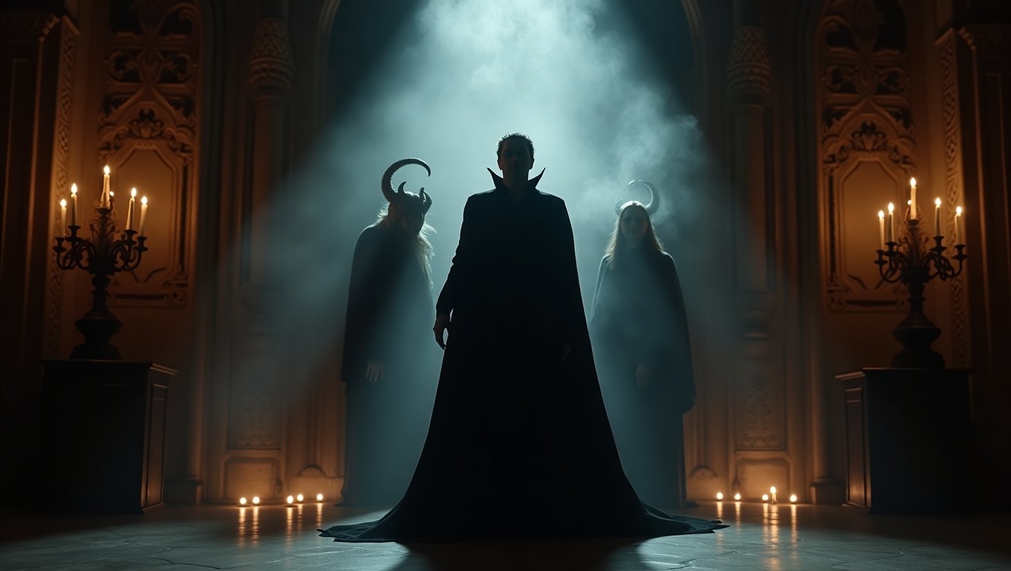 A podcast setup with a large microphone on a stand positioned on a table. Nearby are a pair of black headphones and a laptop. Two people are in the background, one typing on the laptop and the other holding headphones. The setting appears to be a studio with soundproofing elements.